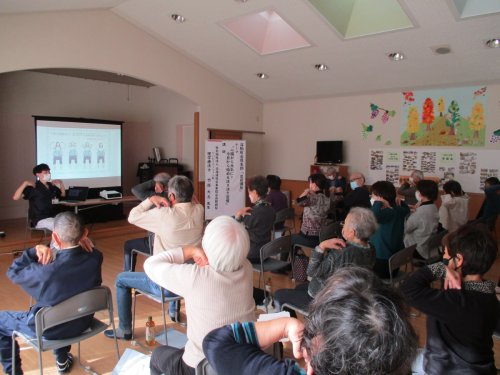 心臓の機能や心不全のお話、予防方法などお話ししました。自宅でできる簡単ストレッチを一緒に行い、楽しみながら学んでいました。
